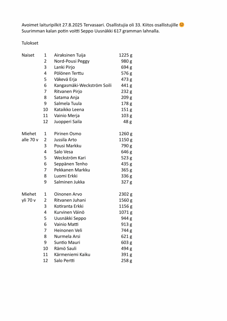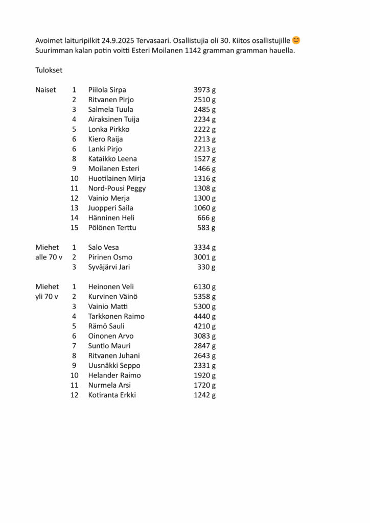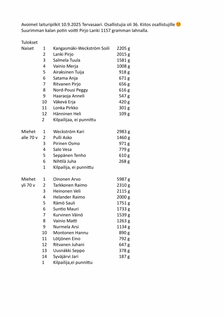 Seuramme menestyjiä PM-laituripilkissä 20.9.2025 Loviisa
